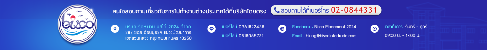 Bisco Placement 2024 Address: 387 Soi Onnut 39, Sukhumvit 77 Rd., Pattanakarn Sub-disrict, Sualuang Didtrict Bangkok 10250 Thailand
